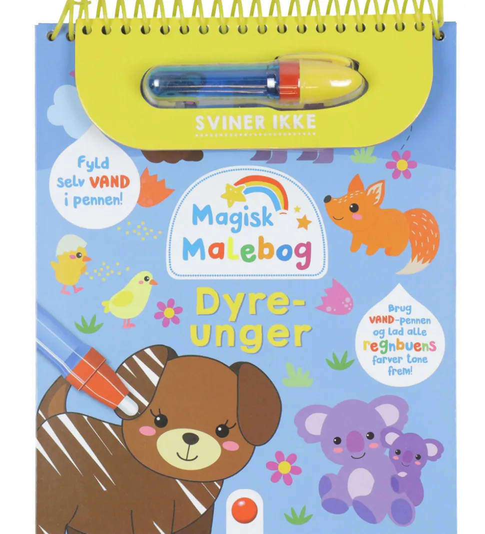Forlaget bolden malebogen har spiralryg og kraftige sider med motiver, der skal males med den medfølgende, magiske pen, som fyldes med vand. Når vandet fra pennen rammer illustrationerne, toner farverne frem.