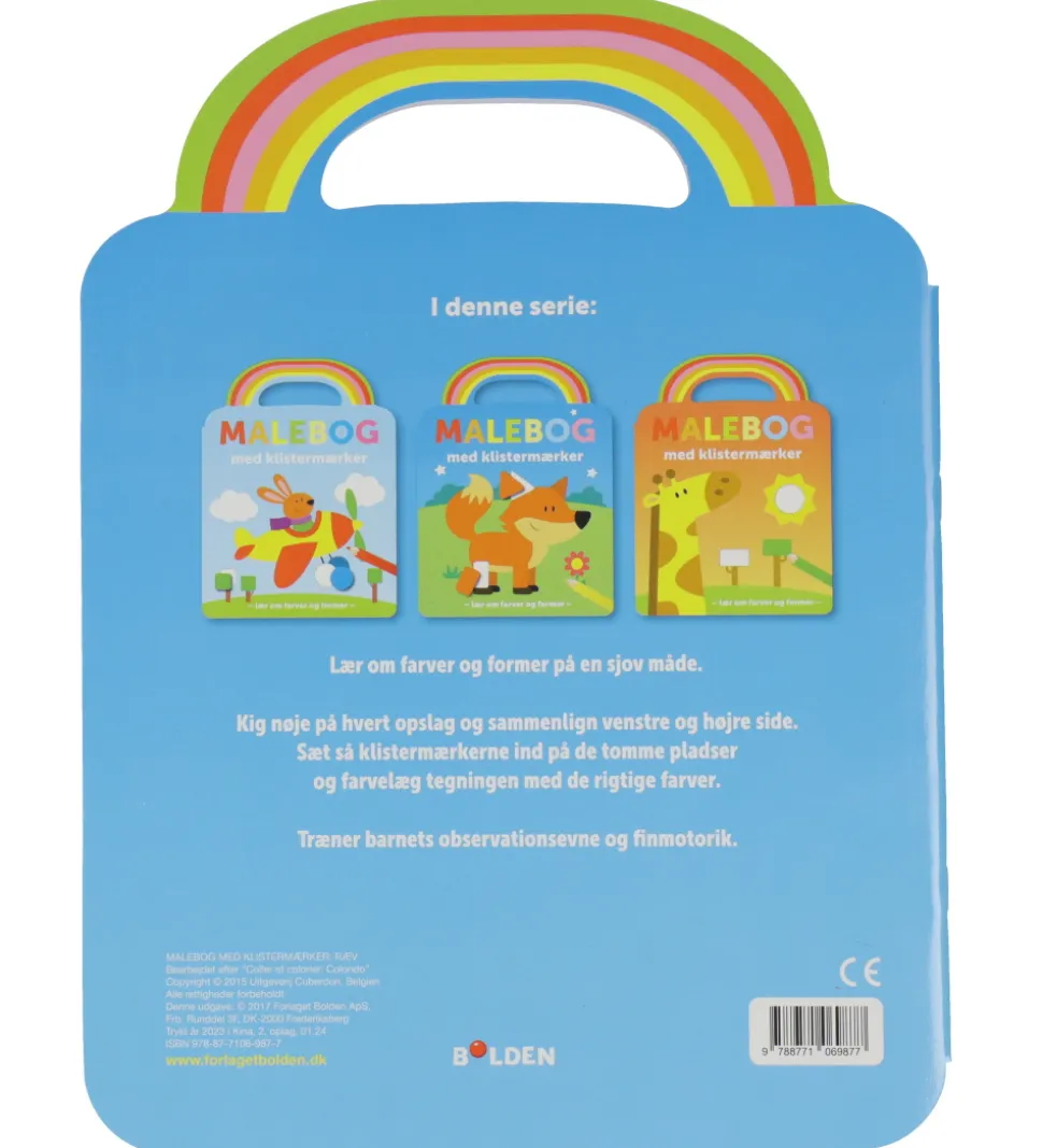 Forlaget Bolden malebogen har 24 sider med delvist farvede illustrationer, som både kan farvelægges og dekoreres med de medfølgende klistermærker. Malebogen lærer børn og om farver og former.