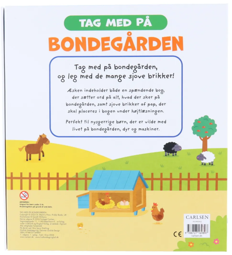 Forlaget Carlsen aktivitetsbogen rummer otte sider med bondegårdssituationer, hvor der mangler forskellige dele. Der medfølger 23 brikker, som de manglende dele skal fyldes ud med.