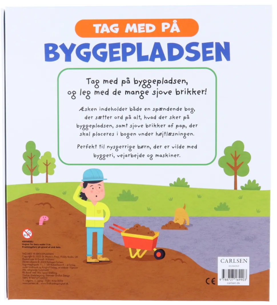 Forlaget Carlsen aktivitetsbogen rummer otte sider med byggeplads-situationer, hvor der mangler forskellige dele. Der medfølger 23 brikker, som de manglende dele skal fyldes ud med.