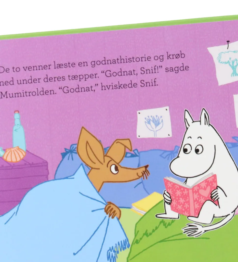 Billedbogen indeholder flotte og farverige illustrationer samt en sød historie om Mumis første soveaftale. Forlaget Carlsen bringer eventyrlig læsning til de små.