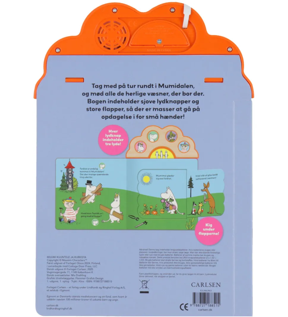 Forlaget Carlsen bogen handler om Mumitroldenes univers, med sjove lydknapper og store flapper, som man kan gå på opdagelse i undervejs i fortællingen.