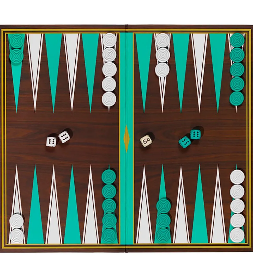 Sjovt Games Room backgammon i blågrøn, creme og sort.