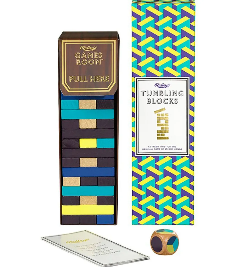 Flot Games Room klodsmajor-spil bestående af en terning og 57 klodser i sort, brun, gul og blå.