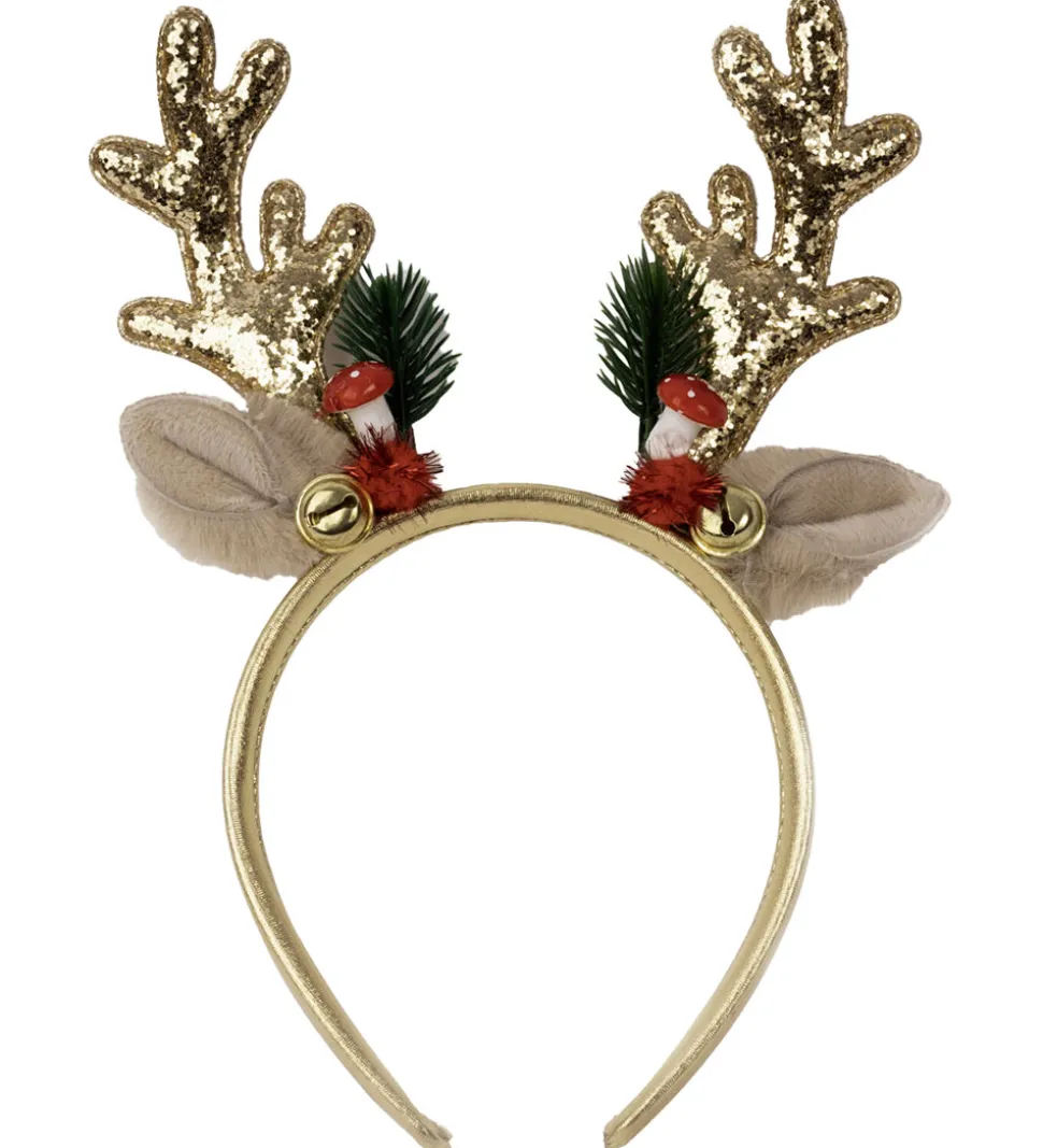 Sød Great Pretenders hårbøjle i guldklimmer med Rudolf-gevir, fine ører, gran, bjælder, små svampe og pomponer.