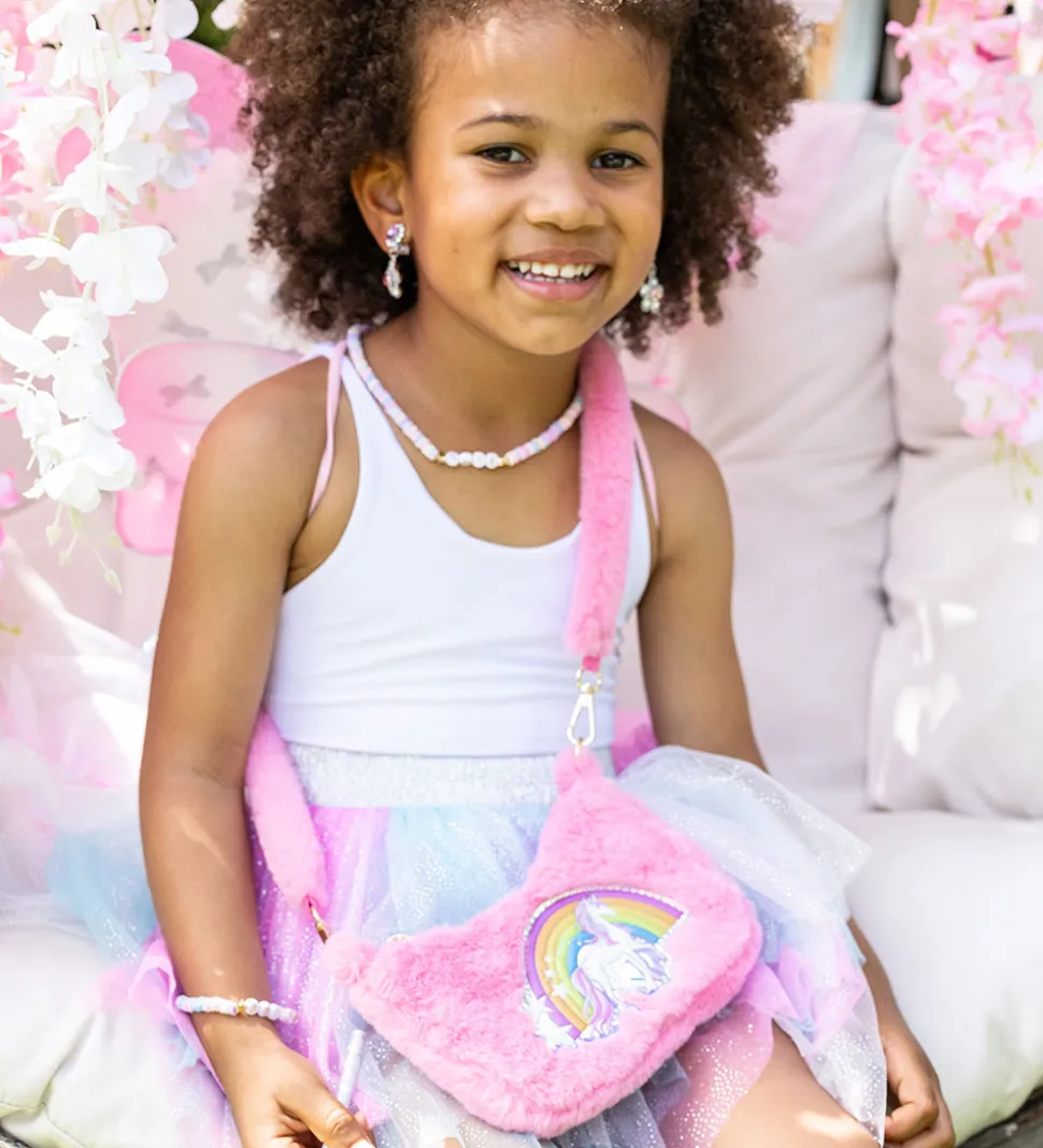 Farverig Great Pretenders skuldertaske med et sødt enhjørning- og regnbueprint på fronten. Tasken er i en pink nuance og har en blød overflade af imiteret pels, samt en praktisk skulderrem.