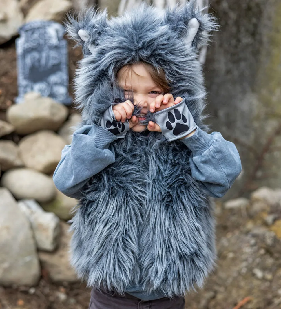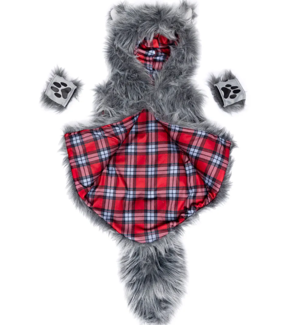 Great Pretenders udklædningen er gråt, imiteret pels med hætte som ulvehoved samt en ulvehale og med separate handsker som ulvepoter. Indvendigt har vesten et rødt, ternet for. Vesten lukkes under hagen med velcro.