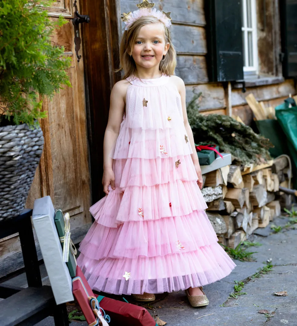 Great Pretenders udklædningen er rosa med mange lag tyl, fastsyede slikstokke og juleklokker, og i bunden er der en metalring, som giver kjolen den karakteristiske juletræsform.