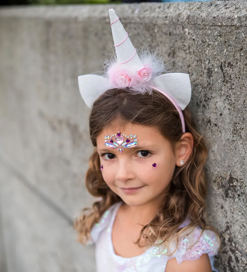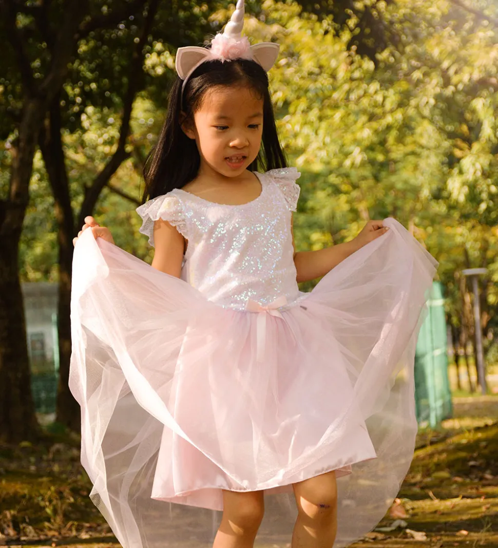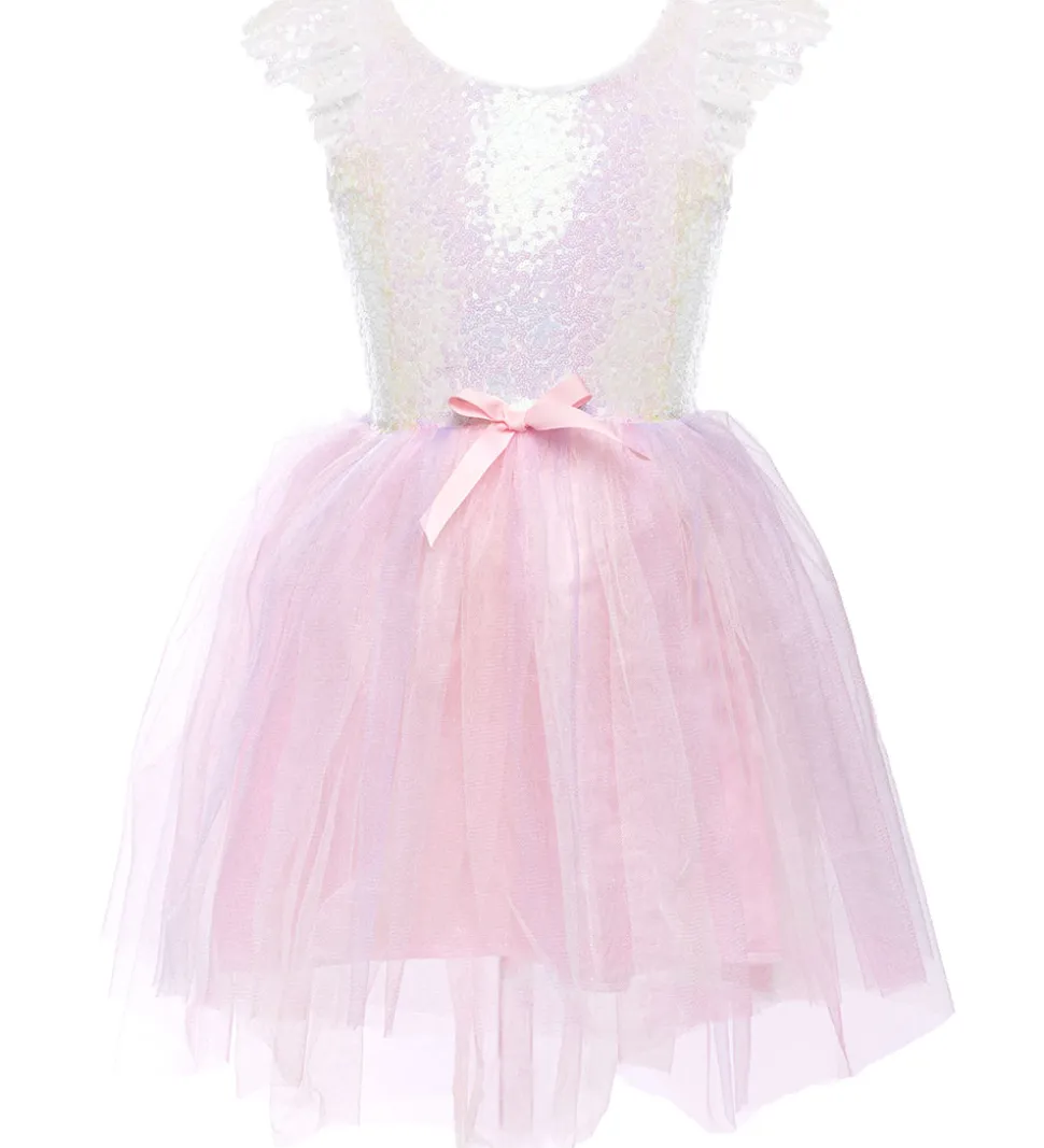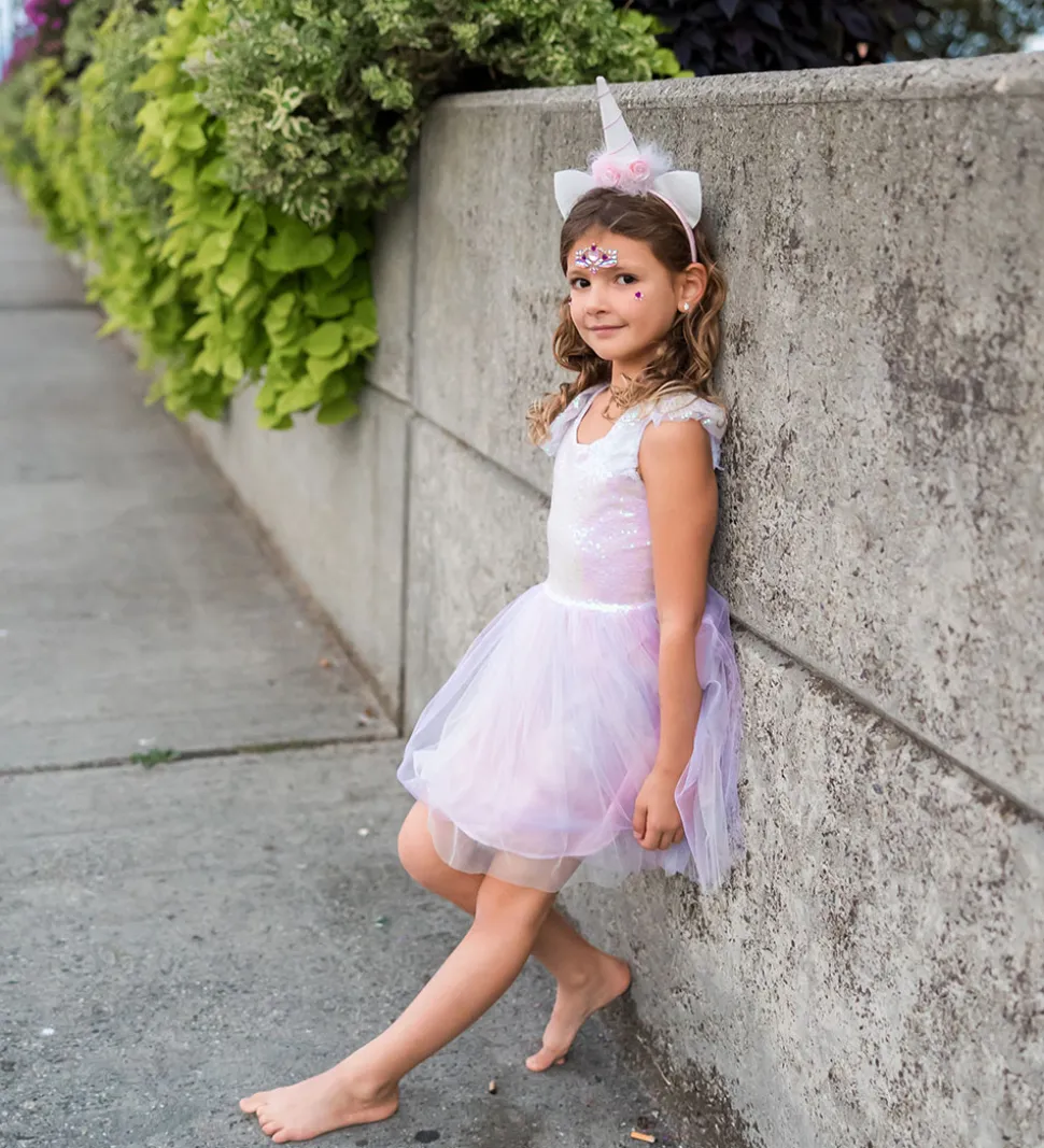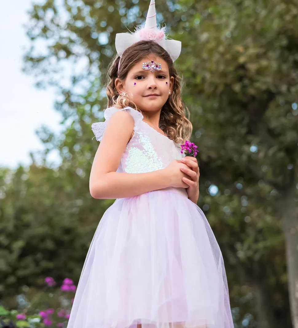 Flot Great Pretenders udklædning bestående af en kjole i hvid, med hvide palietter på toppen fortil og et skørt i rosa of lilla mesh, og flæser i rosa mesh i skuldrene og under halsen. Der medfølger en flot hårbøjle i hvid, med søde ører og et enhjørningehorn i hvid og rosa med flotte blomster i rosa, grøn og med glimmerdetaljer.