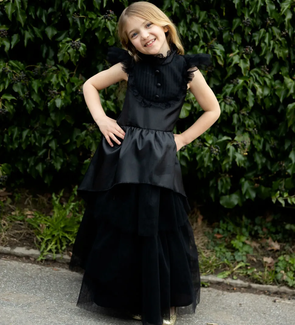 Great Pretenders udklædningen består af en lang, sort kjole med lagdelt tylskørt og lukkes i nakken med velcro.