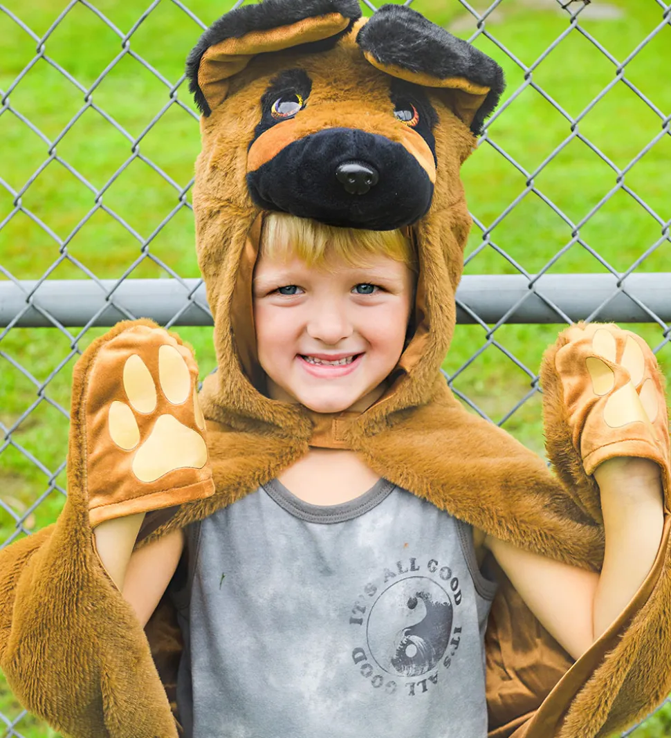 Sjov Great Pretenders kappe der ligner en hund i sort og brun med brune øjne, sort næse og ører på hætten.