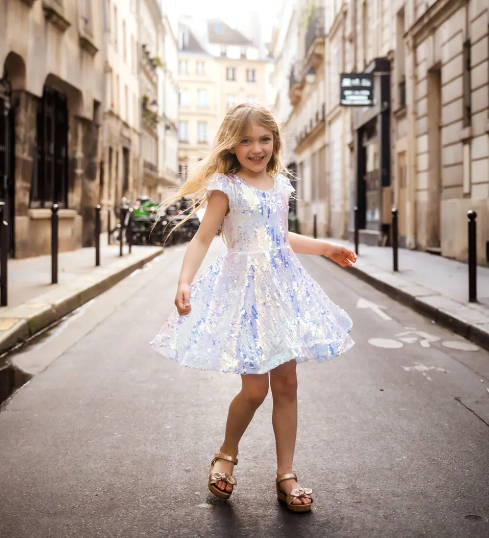 Flot Great Pretenders udklædning i form af en metallisk kjole med hvide og lilla pailletter, så barnet kan klæde sig ud som en pailletkoncert-dronningen.