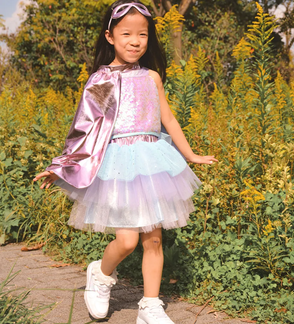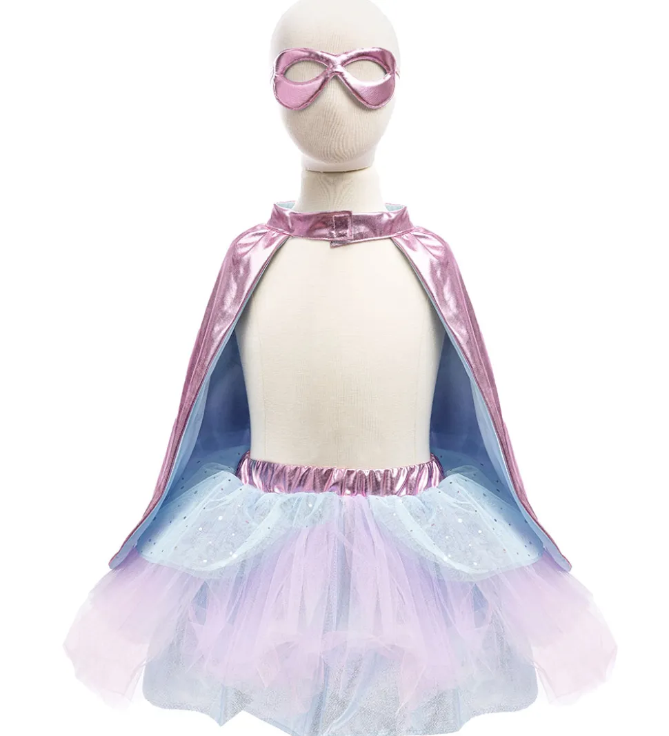 - En kappe i rosa med et skinnende holografisk ydre lag med en stor stjerne på ryggen i lyseblå og med en lyseblå inderside.