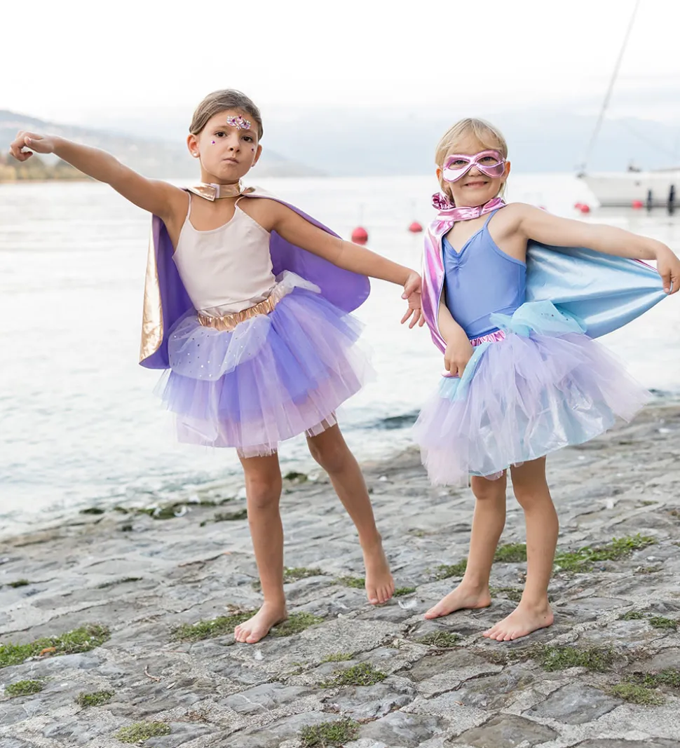 - En nederdel i blå, rosa og lilla nuancer med sølvglimmer, med flere tyl lag.