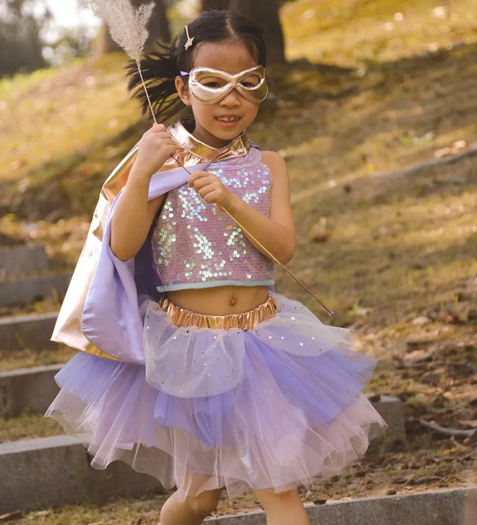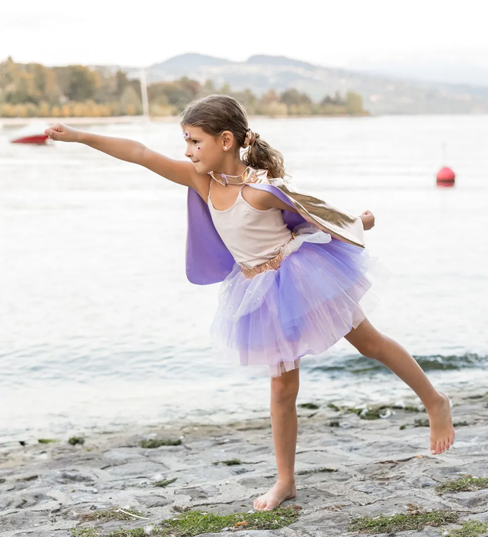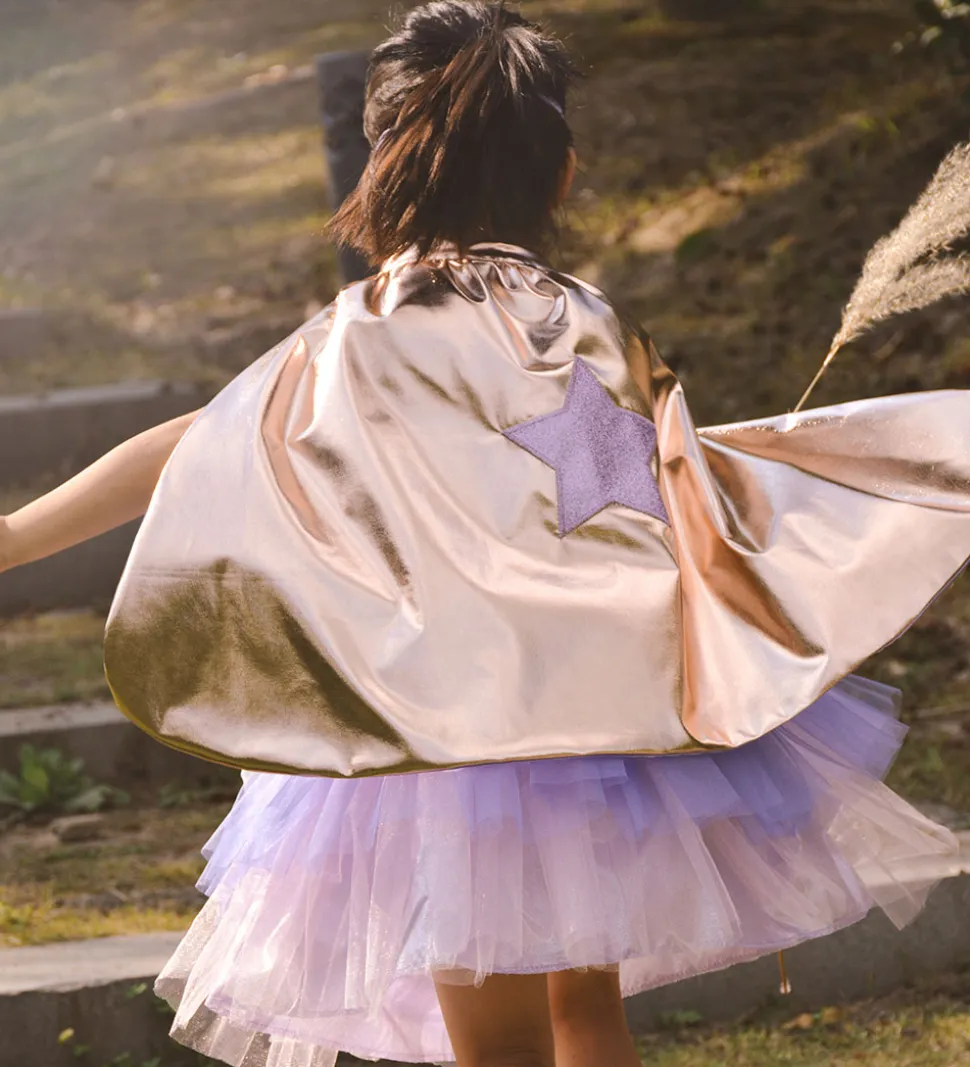 - En kappe i rosaguld med et skinnende holografisk ydre lag med en stor stjerne på ryggen i lilla glimmer og med en lilla inderside.