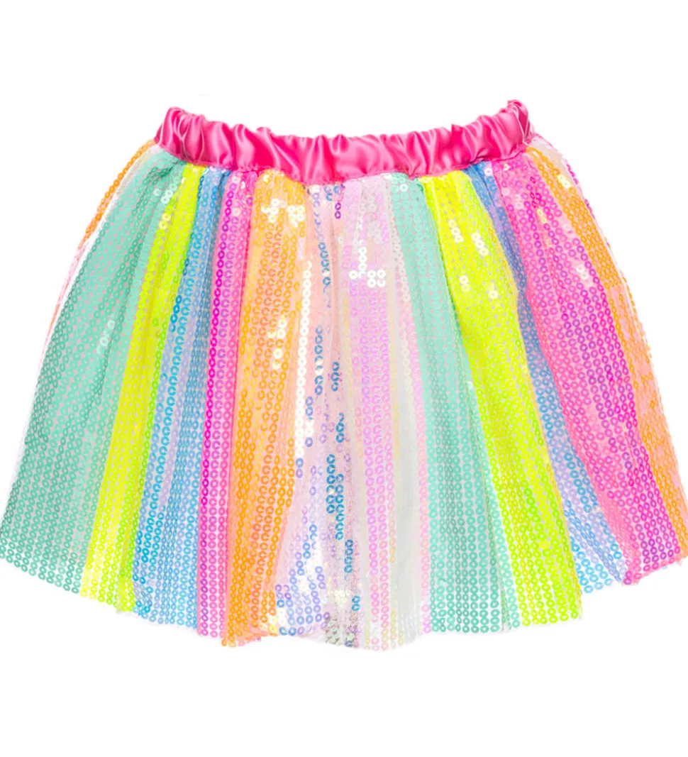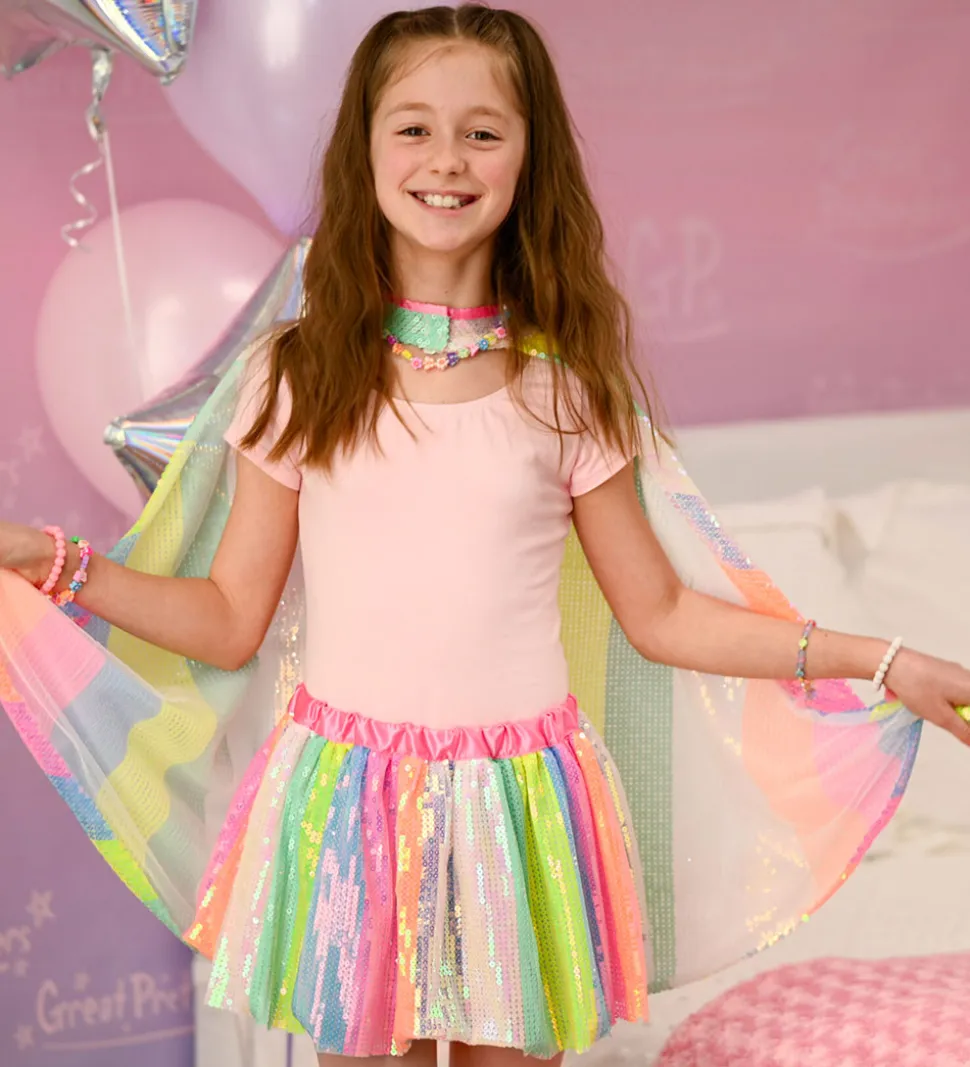 Flot Great Pretenders udklædning i form af en tylnederdel med striber af palietter i rosa, blå, gul, grøn, pink, hvid og orange.