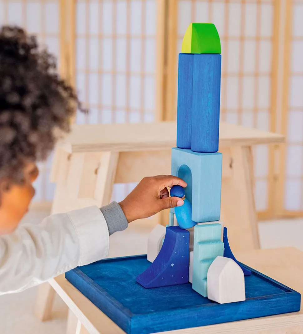 Sjovt Grimms trælegetøj bestående af en firkantet bakke i naturlig træ og 22 malede træklodser i flotte farver, heriblandt to figurer, samt fire plastik-juveler. Temaet er polarlys.