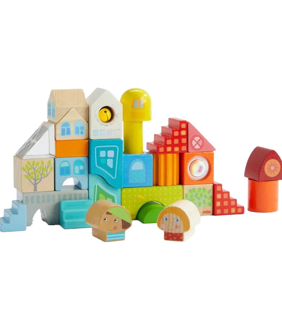 Flotte Haba byggeklodser i træ, hvor nogle er malede i fine farver. Haba sættet består i alt af 28 dele i form af 28 trækodser med bytema.