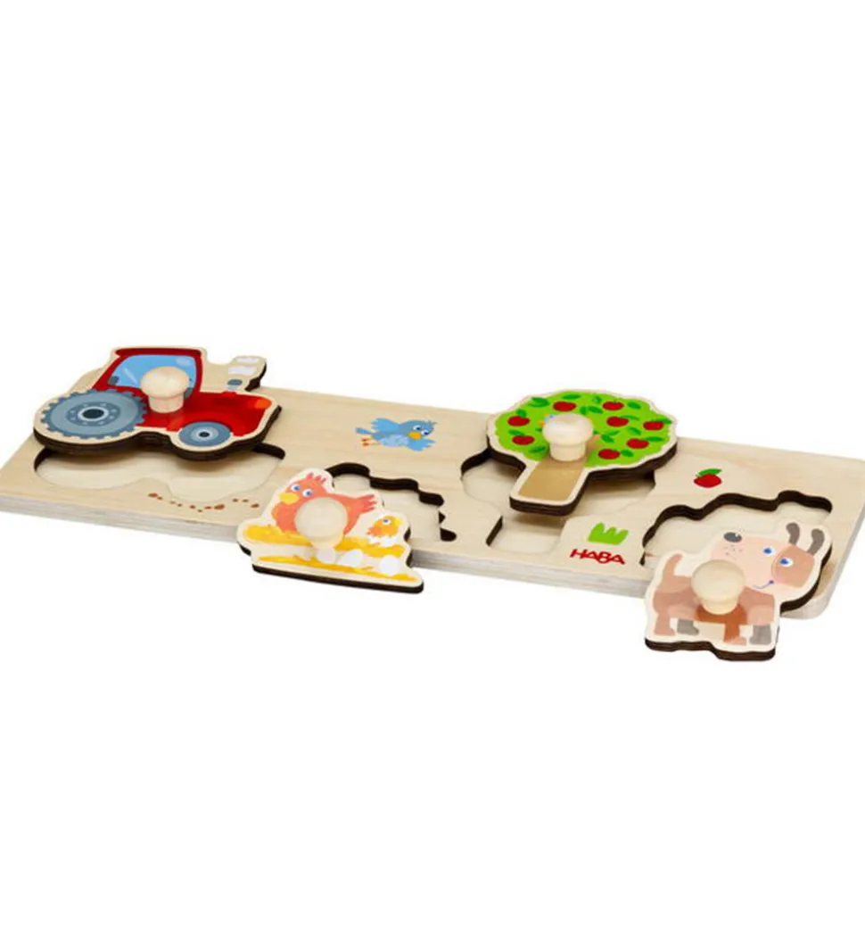 Charmerende HABA puslespil i naturfarve med motiver af en rød traktor, grønne træer og søde dyr. Puslespillet består af 4 brikker som har hver sin unikke form og skal placeres i de tilsvarende huller. Den røde traktor og de medfølgende dyrebrikker gør legen både sjov og lærerig for de små.