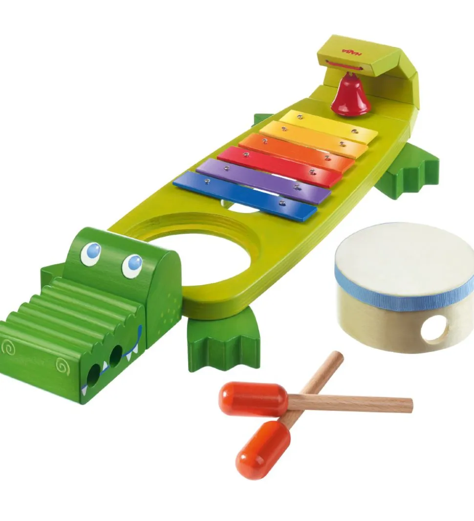Haba Xylofonen er af træ og har seks metalbarer i gul, lysebrun, orange, rød, lilla og mørkeblå og kan spilles på med to grebsvenlige trækøller. På krokodillens hale er en sjov klokke, der ringer når halen foldes tilbage. Bag ved krokodillens hoved er en tromme, der kan tages ud og spilles på seperat. Instrumentet giver dit barn en sjov mulighed, for at udforske musikkens verdens og stimulere fantasi og koordination.