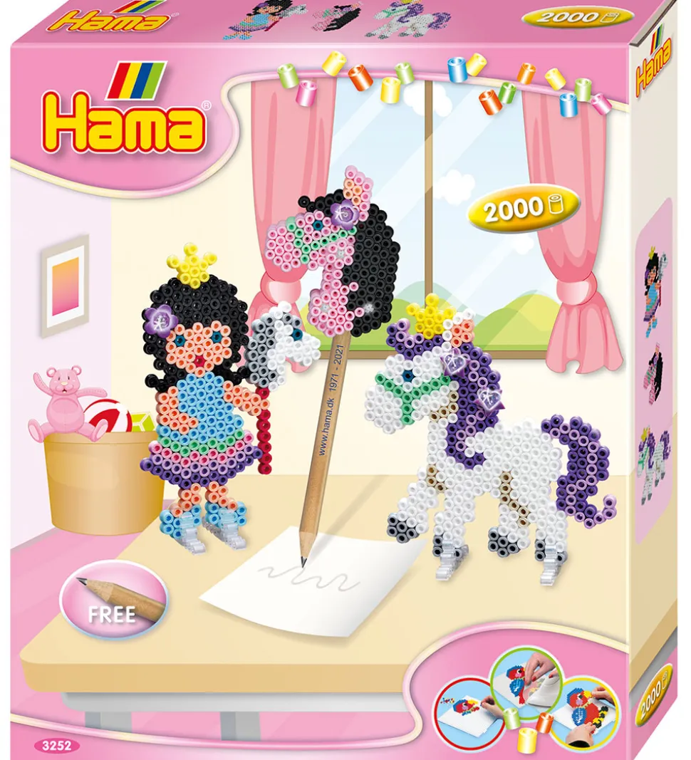 Hama perlesættet kommer i en fin papkasse, og indeholder: