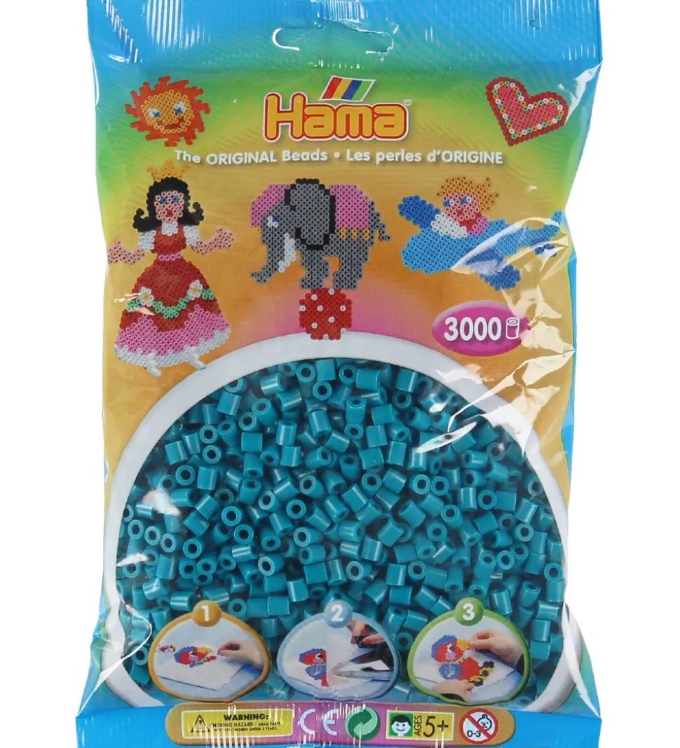 Fine Hama perler i ensfarvet petroleum.