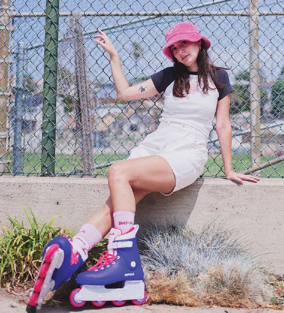 Smarte Impala rulleskøjter i blå med hvide detaljer og pink snøre, hjul og for.
