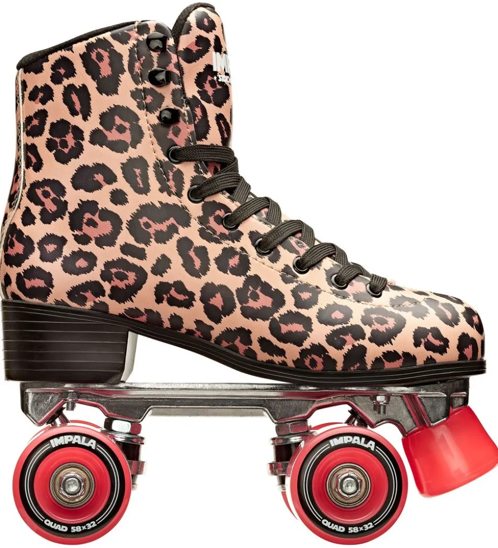 Smarte Impala rulleskøjter med et leopardmønster i brune og sorte nuancer, med sorte snørebånd. Rulleskøjterne har røde hjul med en sort yderside.
