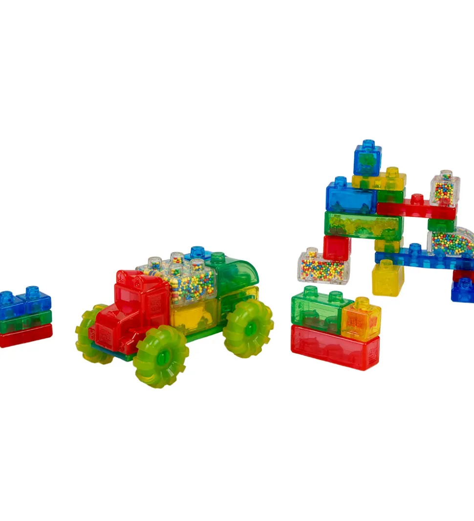 Der medfølger 35 klodser med forskellige størrelse, farver og teksturer til f.eks. at bygge en bil.