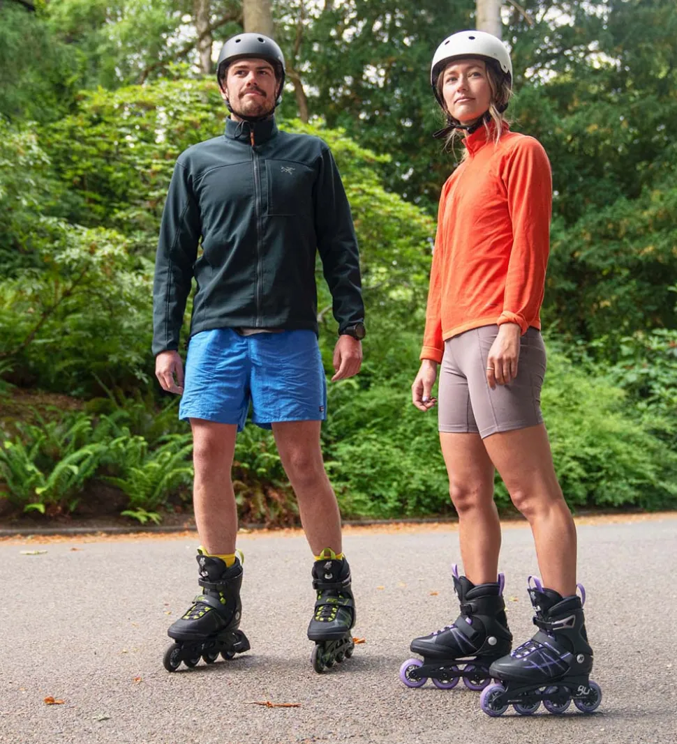 Rulleskøjterne lukkes med både elastiske bånd, en velcrorem og en plastrem, og inlinerne er lette at få af og på. Bagpå er der en stor bremseklods på den højre rulleskøjte, så rulleskøjterne er lette at styre.