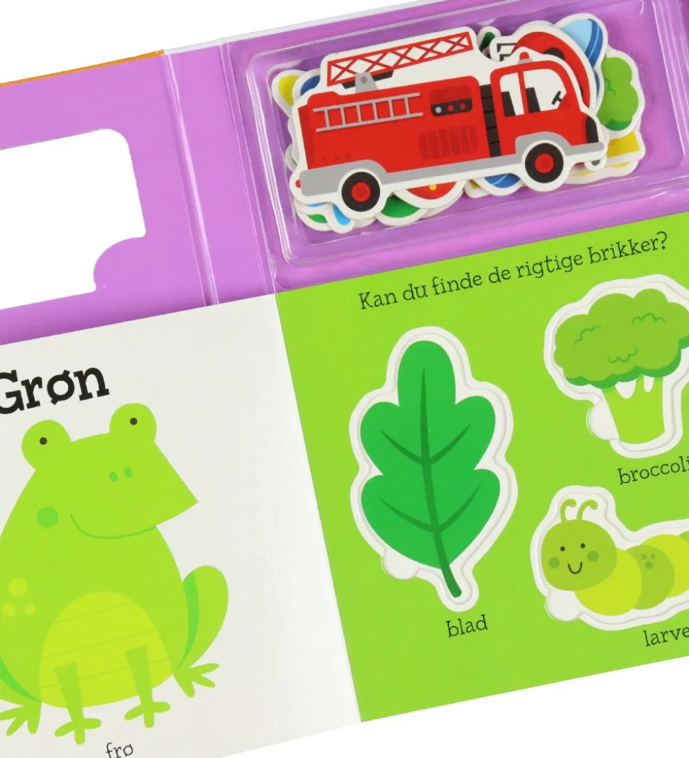 Karrusel Forlag aktivitetsbogen handler om farver. Aktivitetsbogen indeholder fine billeder og holdbare puslespilsbrikker, hvor barnet kan træne sin finmotorik ved at placere brikkerne i de rigtige huller i bogen.