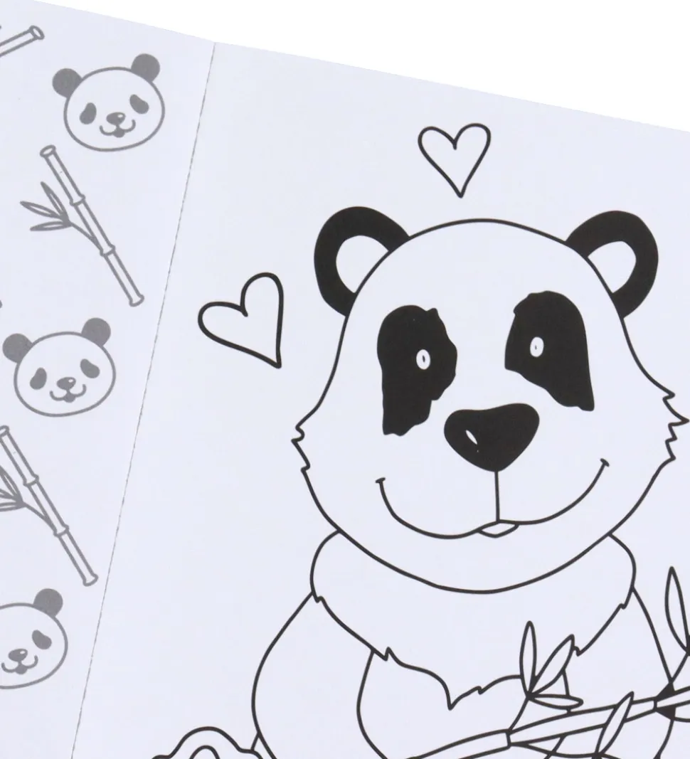 Sød Karrusel Forlag malebog med pandaer, som ender med at blive et farverigt kunstværk.
