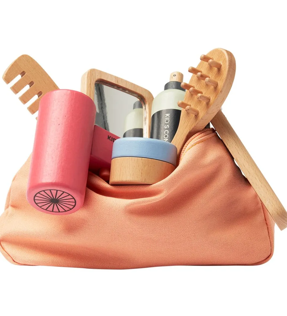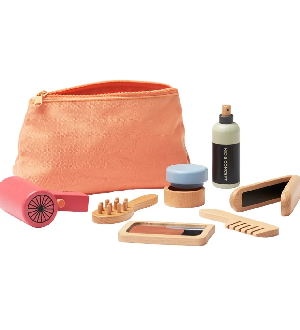 Kids Concept hårstylingssættet er super sjovt for børnene, som vil lege at de kan style hår ligesom ved frisøren eller som forældrene gør. Spraydåsen og hårtørreren har en lille knap, som kan klikkes ind.