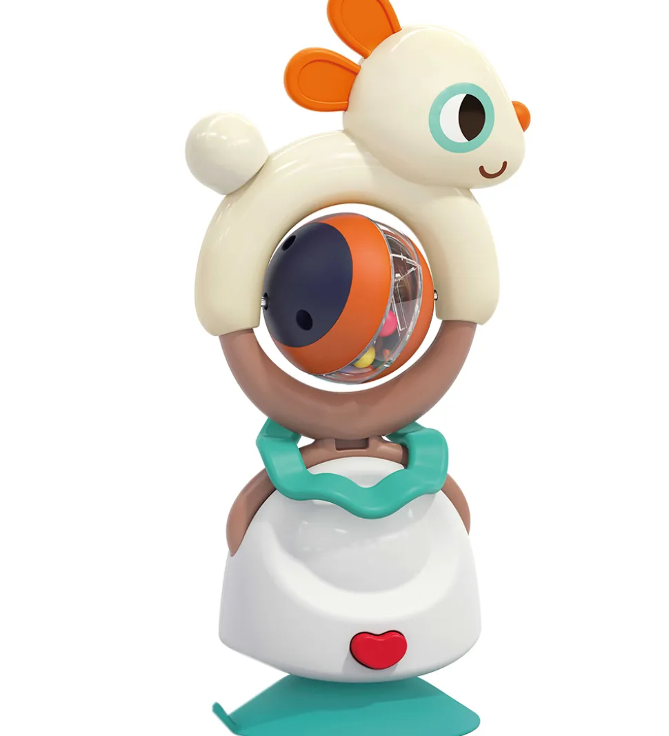 Kinder and Kids legetøjet er en 2-i-1 rangle der kan stilles på gulvet eller sættes på højstolen til at underholde barnet. Ranglen har en roterbar kugle i toppen med rasleperler indeni, som laver sjove stimulerende lyde. Kaninens ører og ring fungere som en bidering. Ranglen har en praktisk sugekop i bunden som kan tages af ved at trykke på knappen, for at afslørre et håndtag.