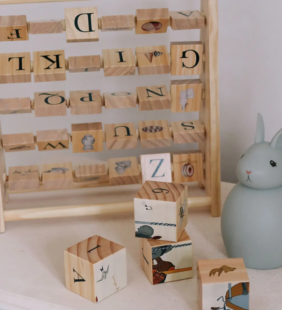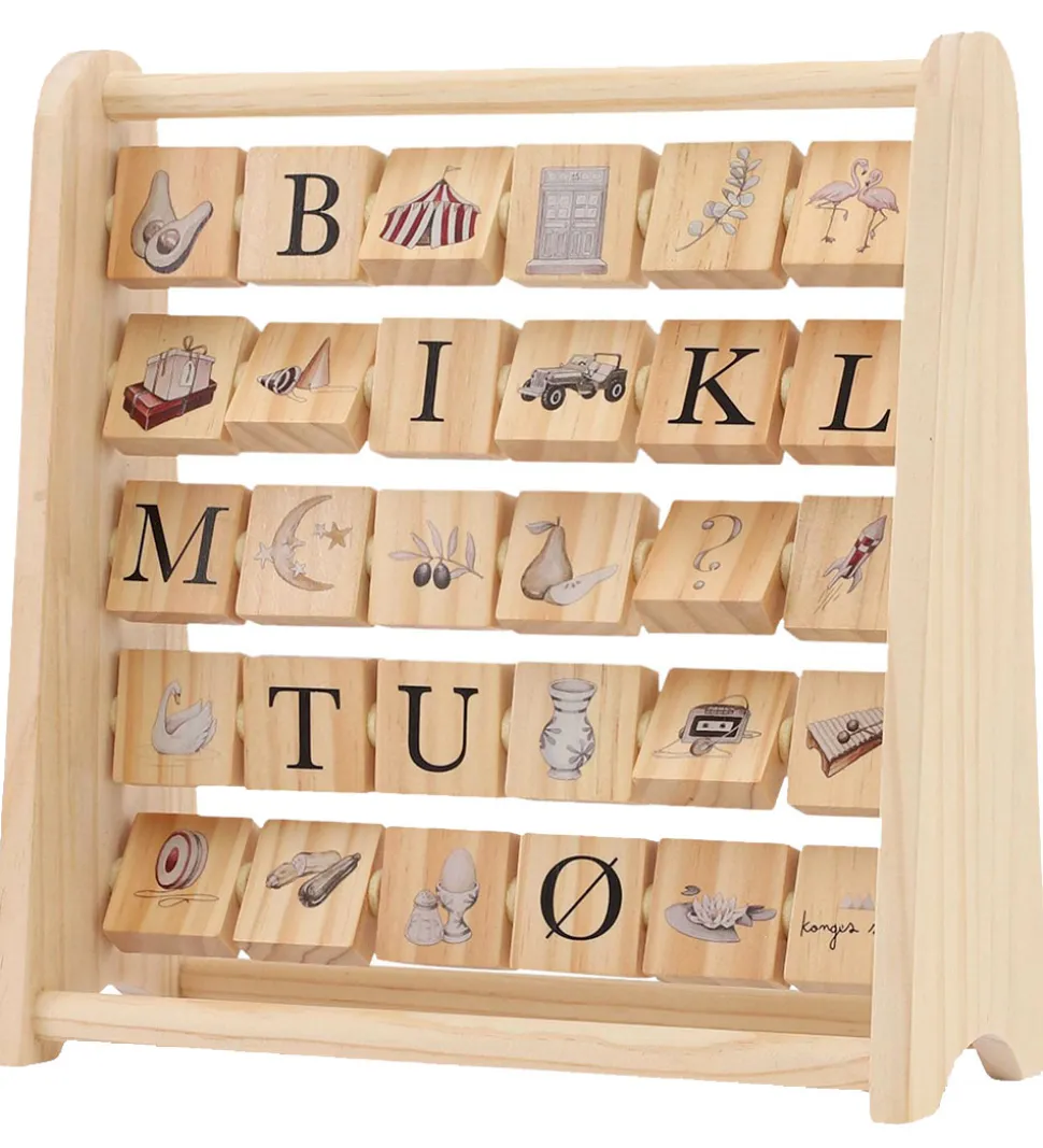 Konges Sløjd ABC blokrammen er lavet som en kugleramme og rummer hele alfabetet på den ene side og illutrationer på den anden, og de enkelte blokke kan drejes og kombineres på alle mulige forskellige måder for sjov leg og læring.