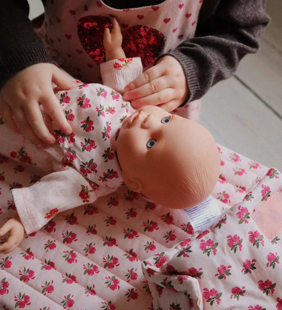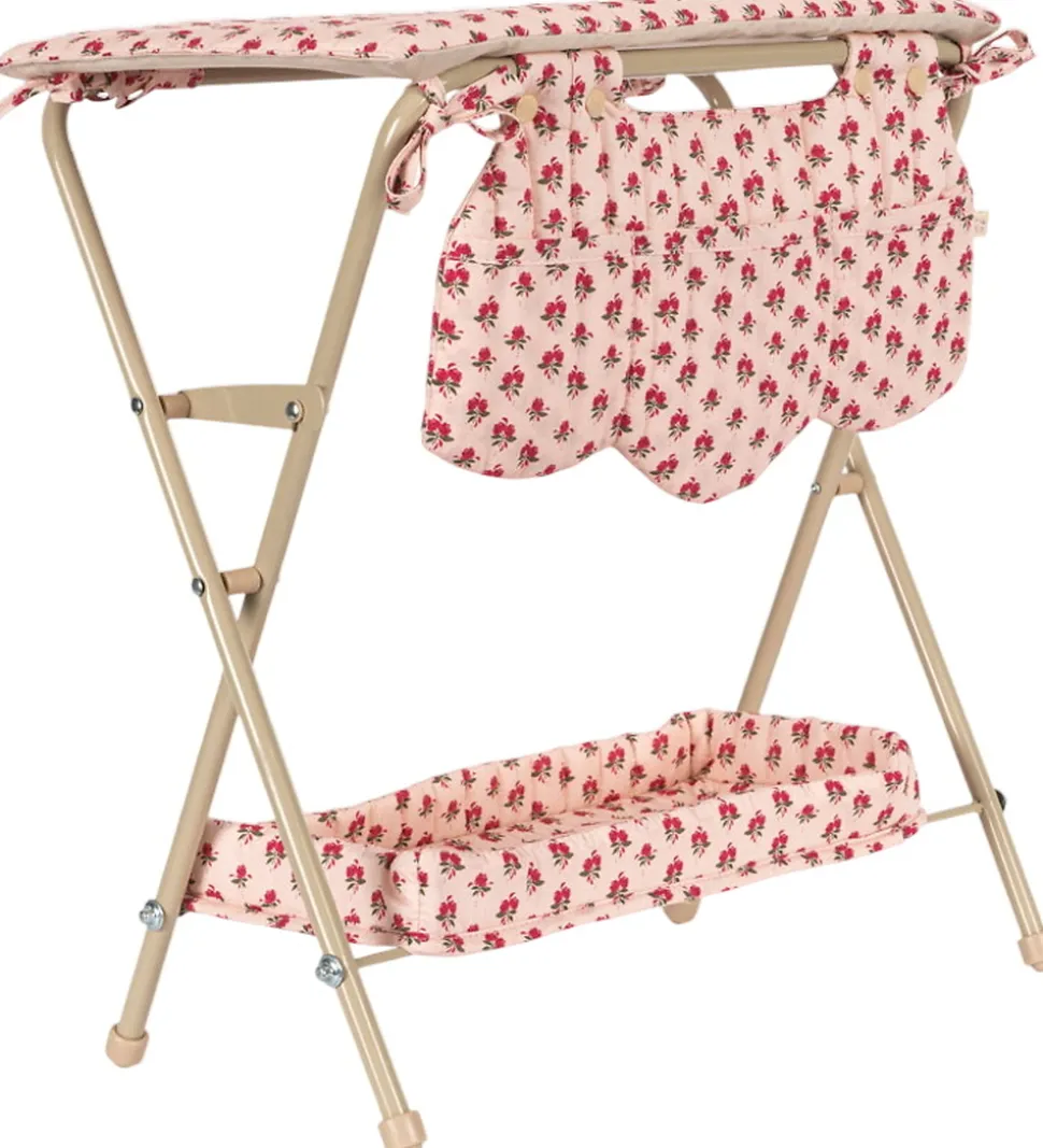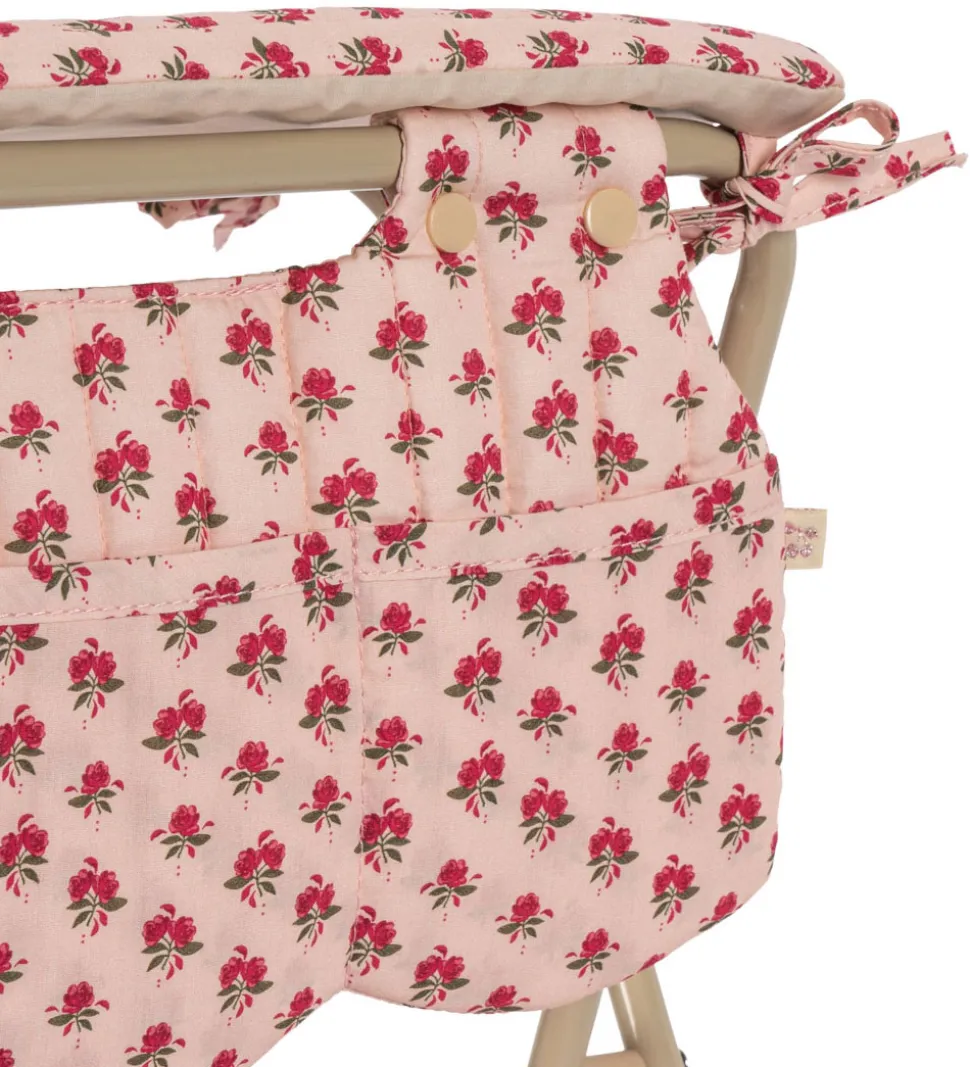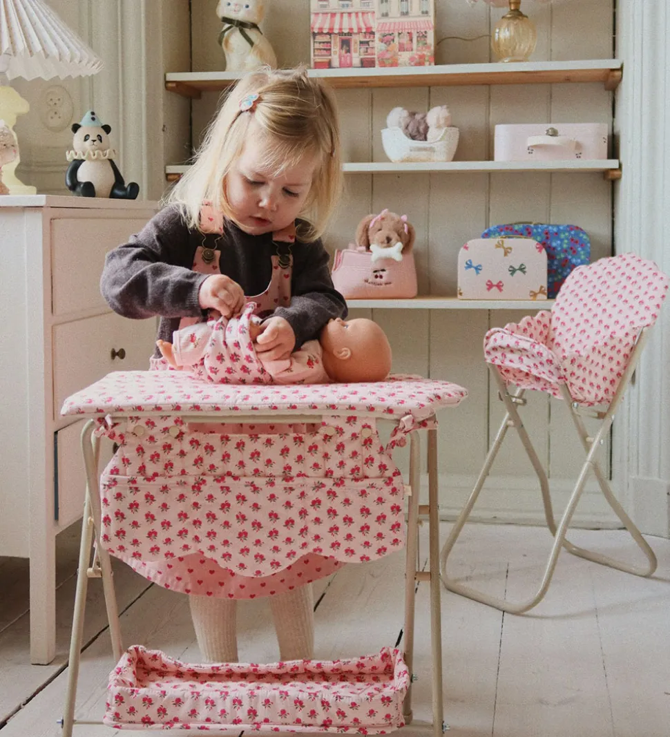 Smart Konges Sløjd puslebord til dukker i lyserosa med et rødt blomsterprint og med en quiltet struktur samt bølgede scallop-kanter.