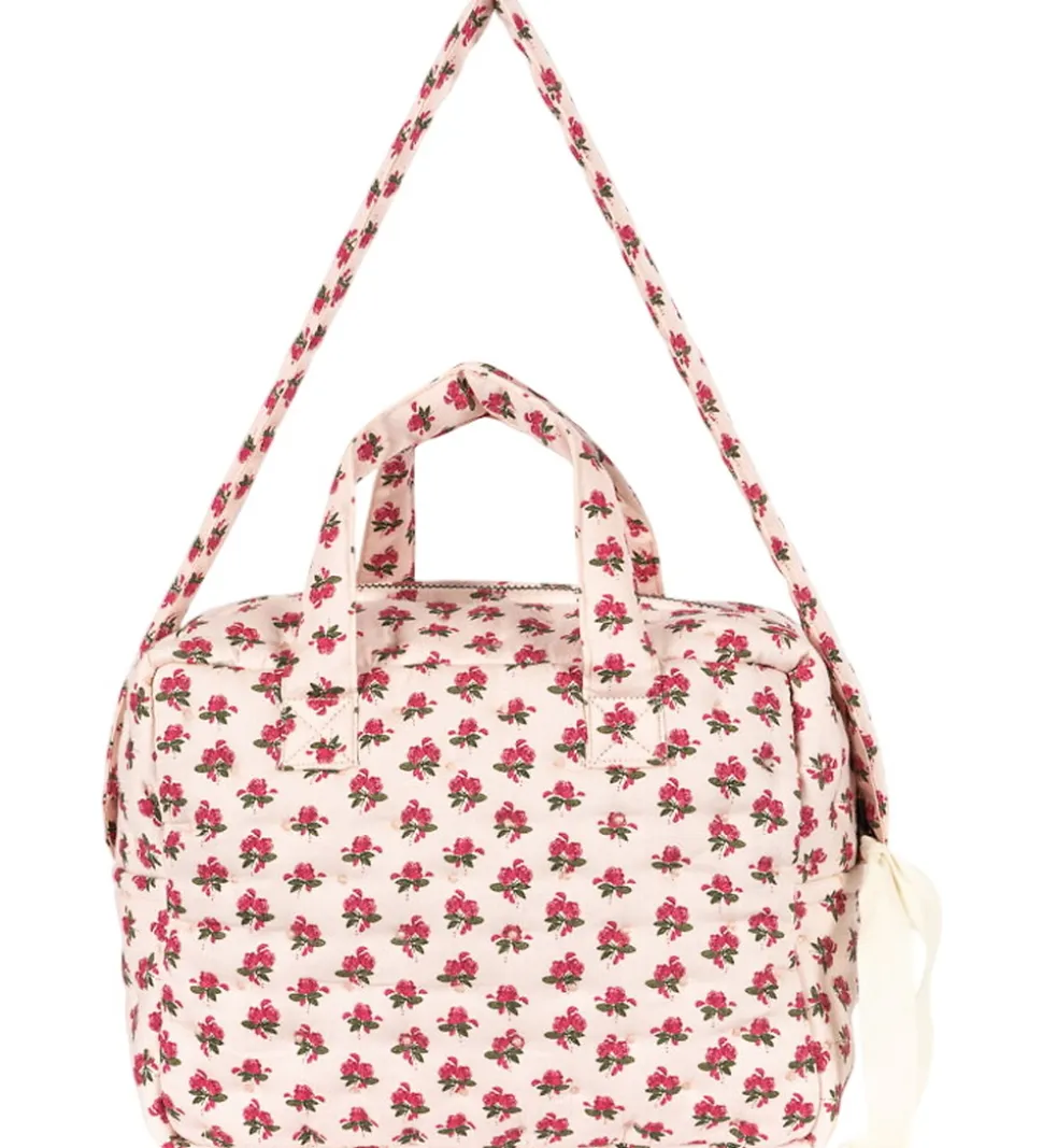 Skøn Konges Sløjd dukke pusletaske i en lys rosa med et rødt blomstermotiv.