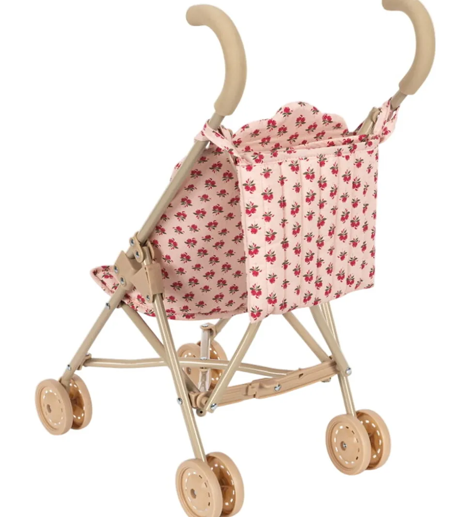 Smart Konges Sløjd dukkeklapvogn i lyserosa med et flot blomsterprint i røde nuancer.