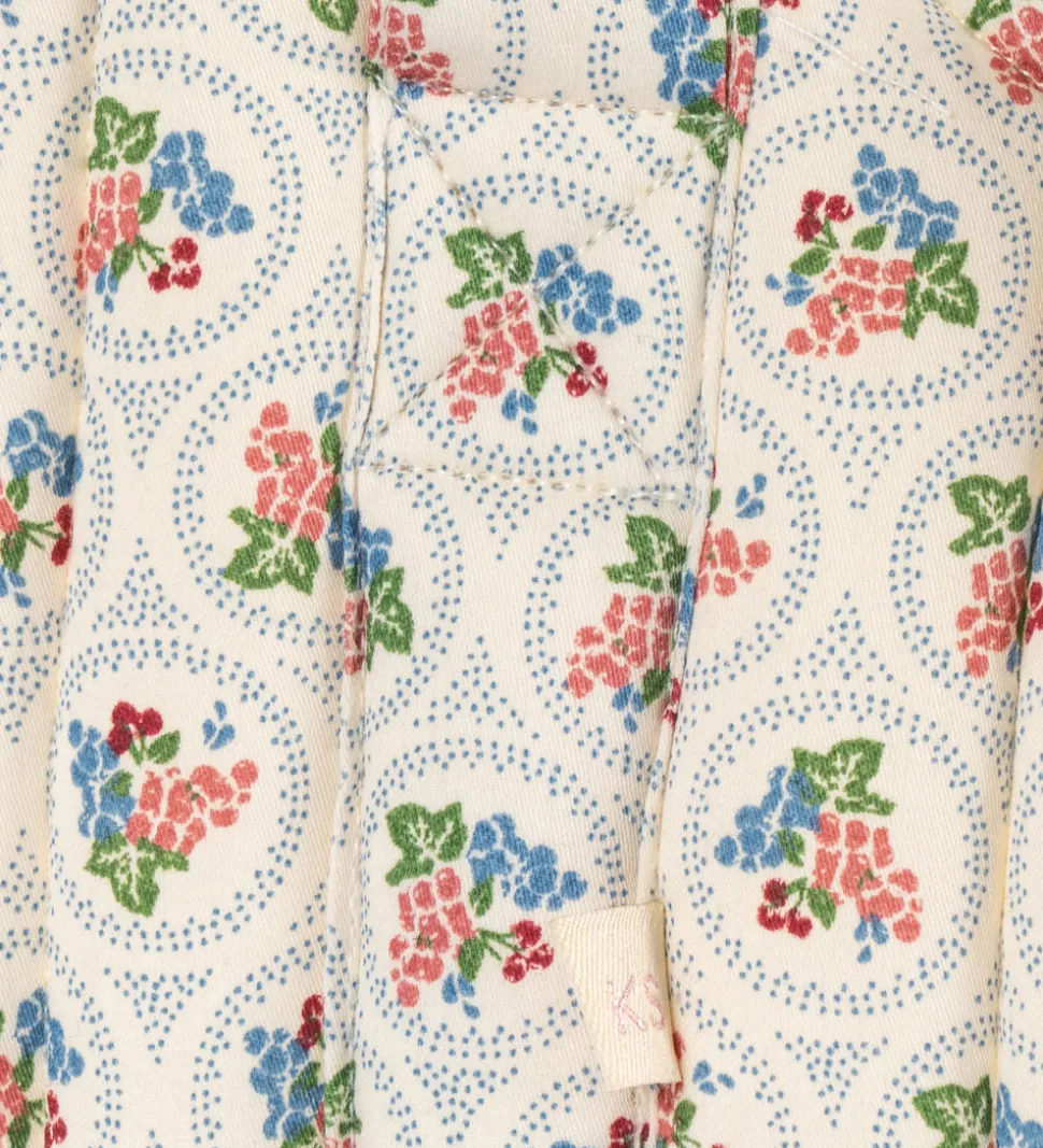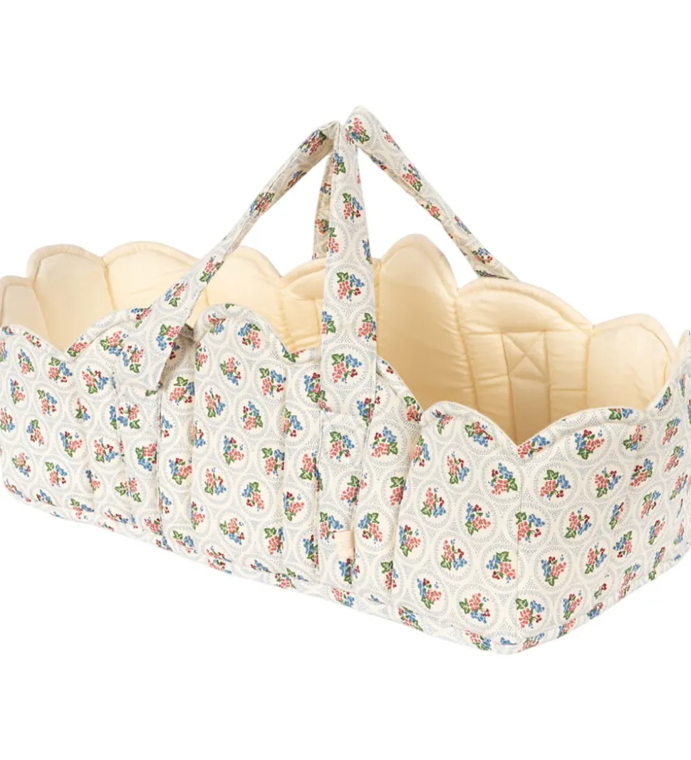 Smart Konges Sløjd dukkelift i hvid med et blåt, fint mønster og blomster i grøn, rosa, rød og blå. Dukkeliften har en quiltet struktur samt bølgede scallop-kanter.