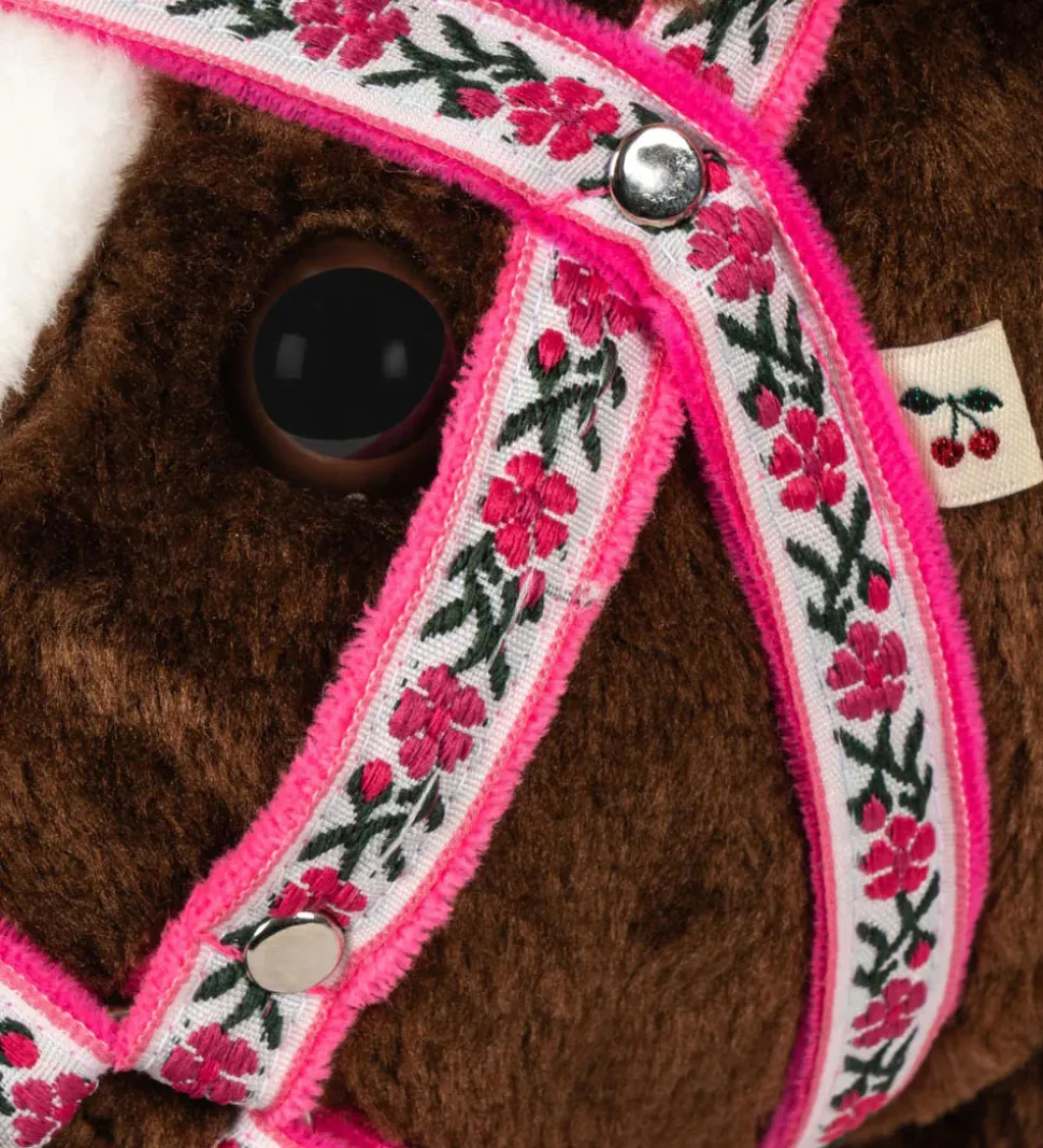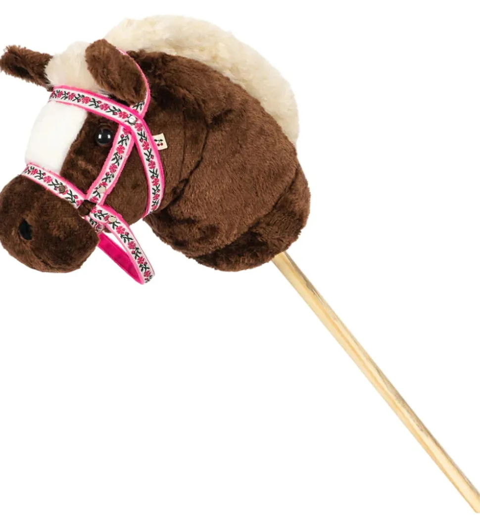 Flot Konges Sløjd kæphest i brun med en hvid manke og hvidt seletøj med rosa blomster.