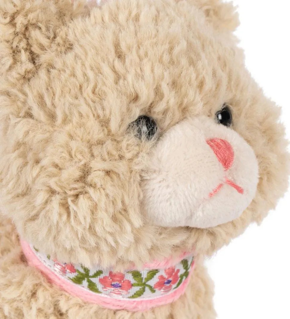 Charmerende rangle fra Konges Sløjd udformet som en blød kat i beige plys. Ranglen har detaljer som en lyserød snude og et blomstret bånd om halsen, hvilket giver et sødt udtryk.