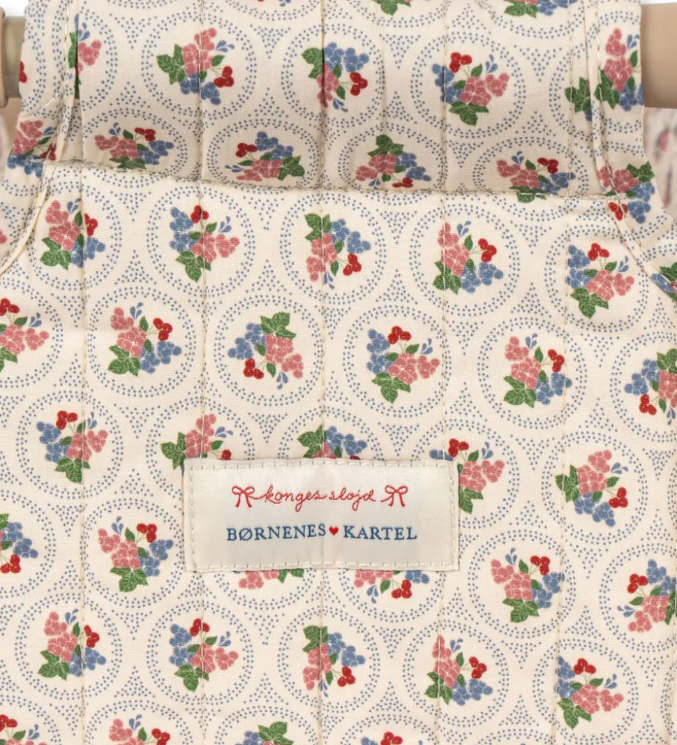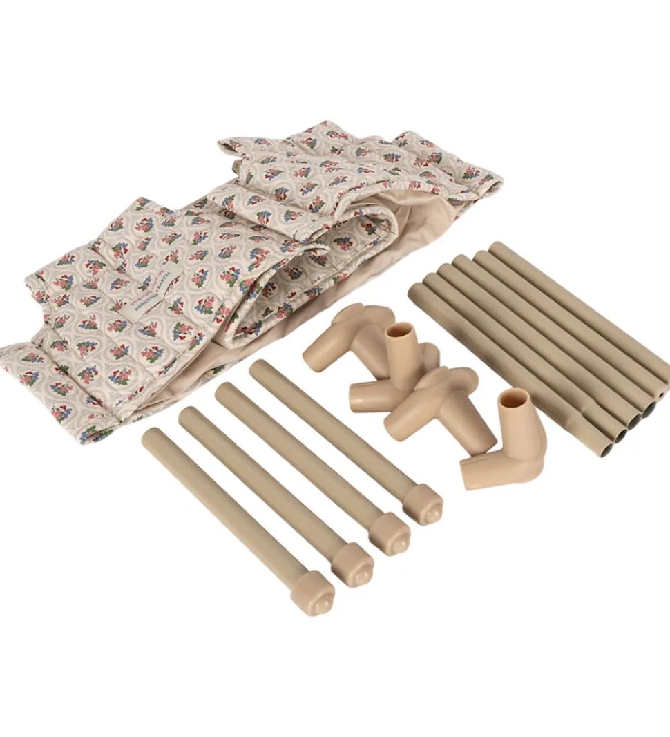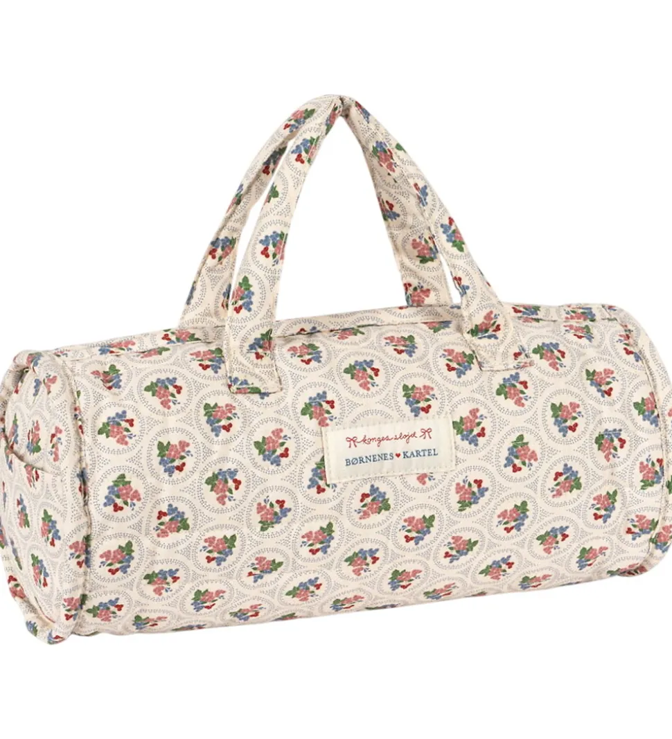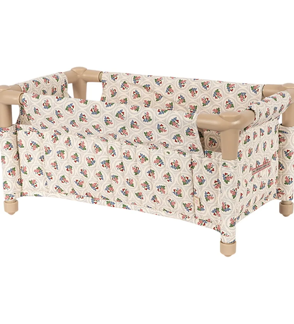 Lækker Konges Sløjd rejseseng til dukker i beige med et print med røde og blå blomster.