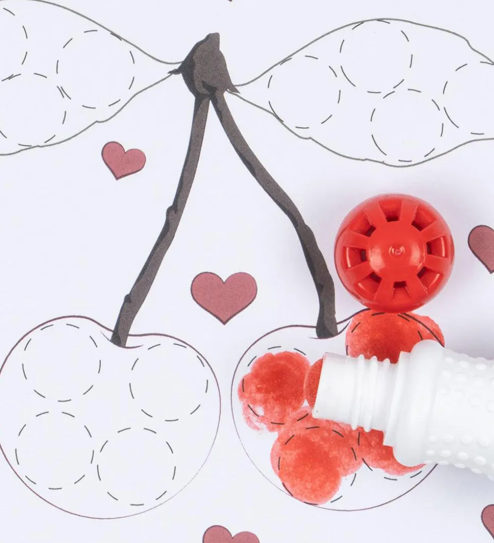Fine Konges Sløjd tucher, som er særligt designende til at lave prikker, i et sæt, hvor der medfølger 4 tucher med farverne gul, rød, blå og grøn samt 12 tegneark med halvt farvelagt motiver, der skal tegnes færdige med prikker.