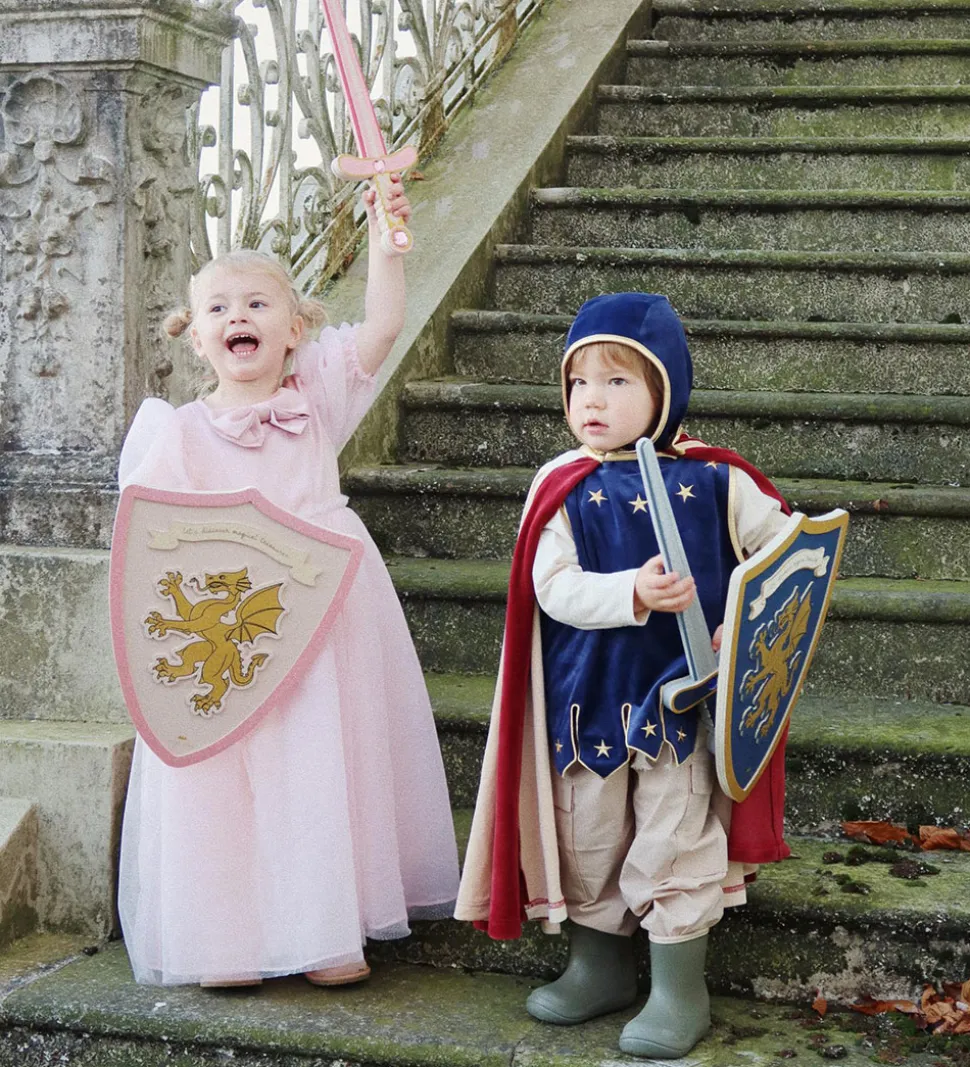 Konges Sløjd kappen har en flot guld krave med en knap på fronten der holder kappen på plads. Vesten har en fastsyet hætte der sidder tæt om ansigtet, samt elastiske guldkanter i alle åbninger. Dette sæt er perfekt til leg og fantasi, så børn kan skabe deres helt egne eventyr.