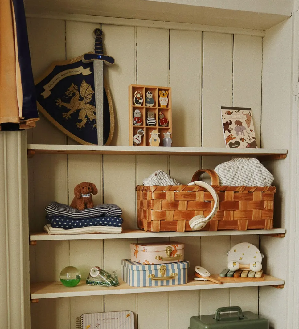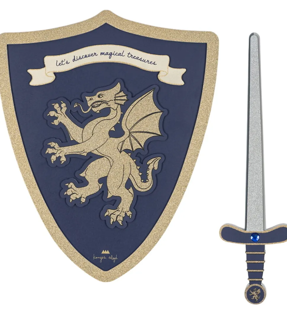 Fantastisk Konges Sløjd udklædning der består af et skinnende sværd og et blåt skjold med gyldne kanter. Skjoldet har et drageprint på fronten, perfekt til små eventyrere.