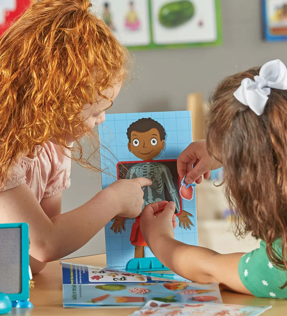 Spændende Learning Resources legetøj med fokus på menneskekroppen. Med sættet kan man øve sig i at identificere og placere organerne, samt scanne kortene for at se nærbilleder af skelettet. Sættet inkluderer 17 dele med aktivitets sider og en 3D-figur med snap-on dele til læring og sjov.