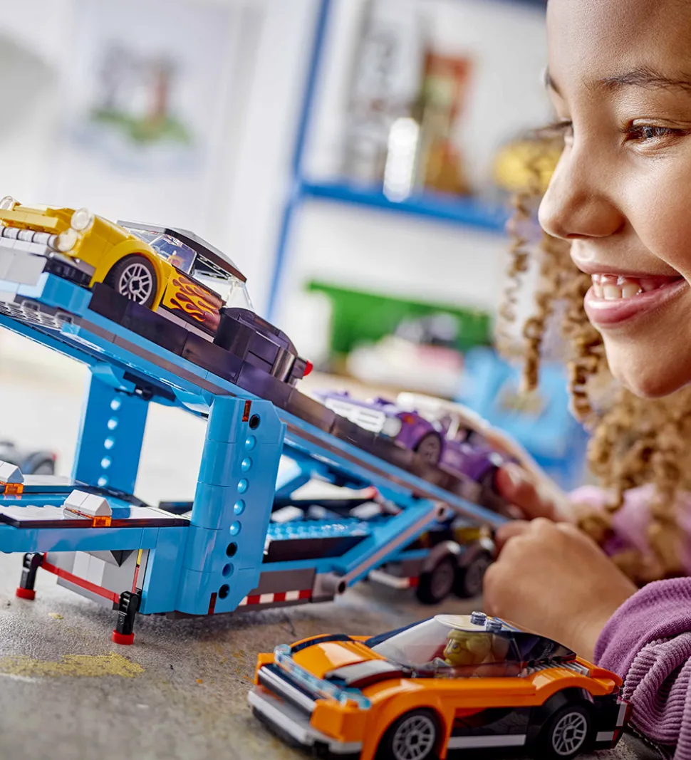 Sejt LEGO® City sæt med i alt 998 klodser, som kan samles til en biltransport med sportsvogne.
