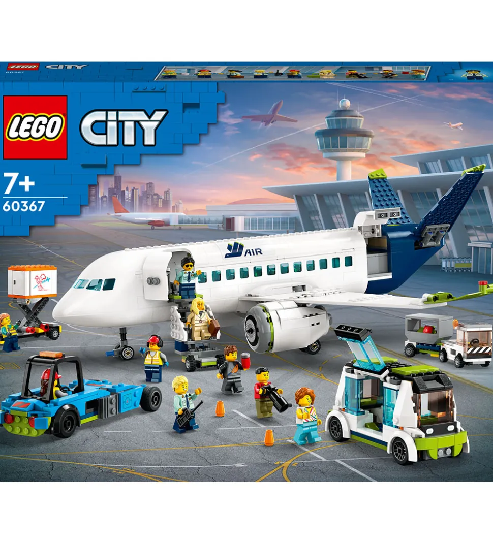 Flot LEGO® City byggesæt med i alt 913 klodser, som kan til et stort passagersfly i hvid og blå, og der medfølger 9 minifigurer