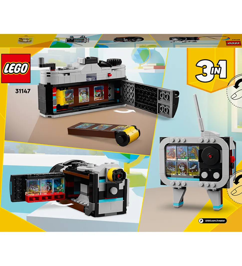 Spændende LEGO® Creator sæt med i alt 261 klodser, som kan samles til hele tre forskellige retroapparat-modeller: et kamera, et TV og et videokamera.