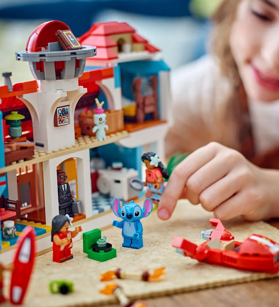 Flot LEGO® Disney sæt med 834 klodser, som kan samles til Lilos strandhus fra Disney-filmen “Lilo & Stitch”. Sættet indeholder detaljer som et rødt tag, veranda, surfbræt og forskellige tilbehørsdele, der bringer scenen til live.